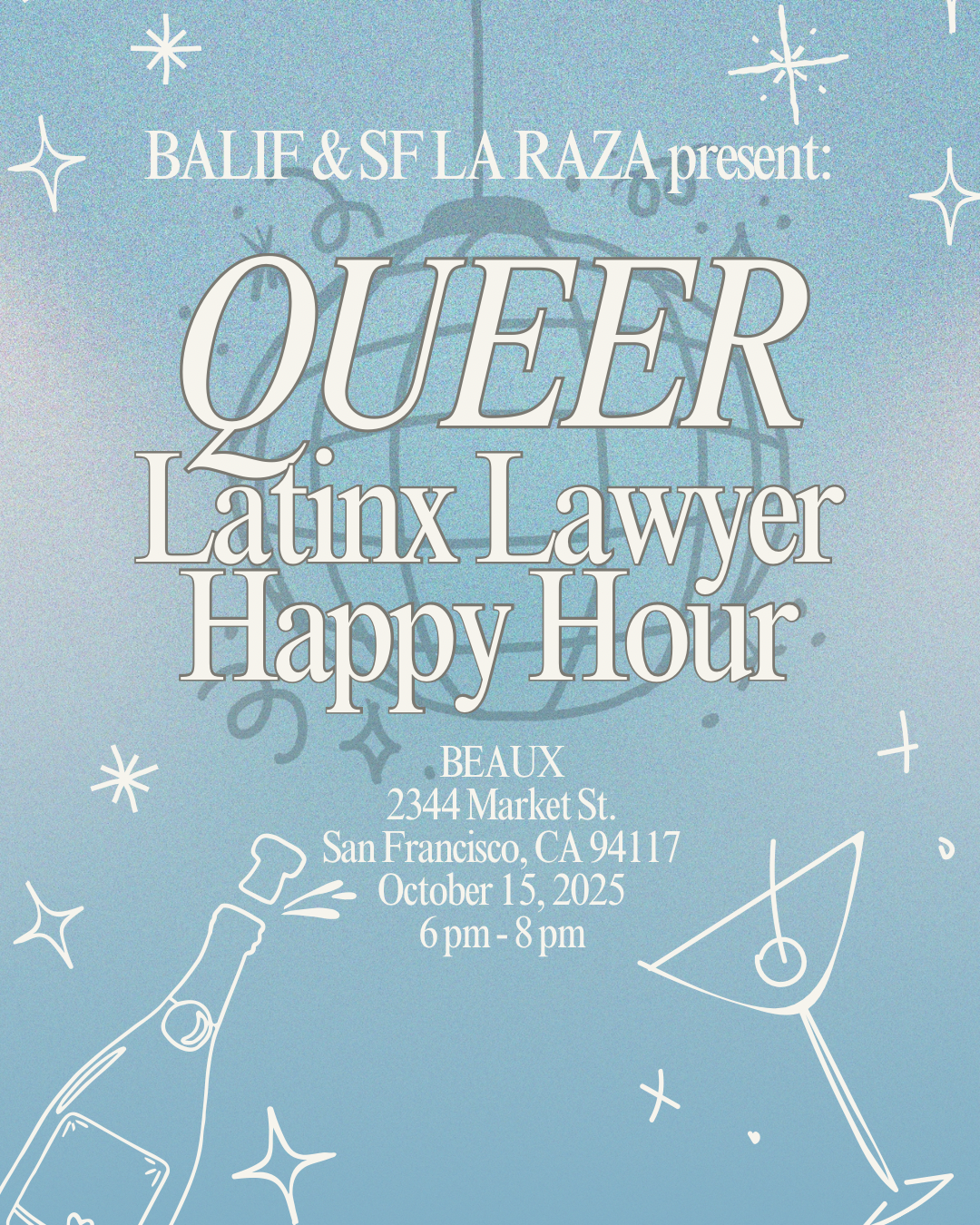 Join BALIF and SF La Raza for our Queer Latinx Lawyer Happy Hour! We will be Beaux on October 15, 2025 from 6pm-8PM.